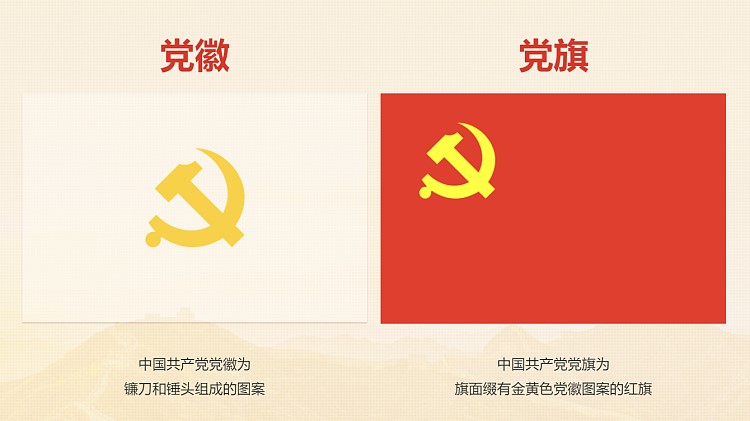 黨徽黨旗表明中國共產(chǎn)黨是中國工人階級(jí)的先鋒隊(duì),同時(shí)是中國人民和中華民族的先鋒隊(duì),是為中國人民謀幸福、為中華民族謀復(fù)興,為堅(jiān)持和發(fā)展中國特色社會(huì)主義、為實(shí)現(xiàn)共產(chǎn)主義遠(yuǎn)大理想而不懈奮斗的馬克思主義政黨。