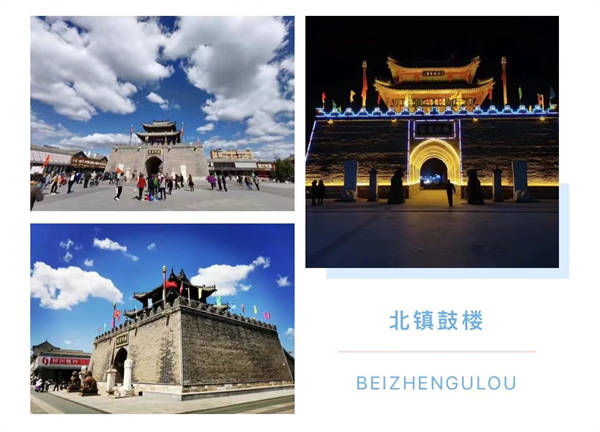 北鎮(zhèn)鼓樓始建于明嘉靖四十二年(1563年),舊為廣寧八景之一,現(xiàn)為全國重點文物保護單位。鼓樓為臺座重檐樓閣式建筑,通高16.9米,由臺座和樓閣兩部分組成。臺座為磚石結(jié)構(gòu),高6.95米,東西長23.75米,南北寬19.25米。臺座中部南北辟券洞門,高5米,寬4.3米。門洞南北門上鑲嵌有石匾額,南題“幽州重鎮(zhèn)”,北題“翼北嚴(yán)疆”。臺座東北角辟一門,門內(nèi)有39級臺階可登臺頂。臺座四周設(shè)有垛口,中央建有重檐歇山頂樓閣一座。