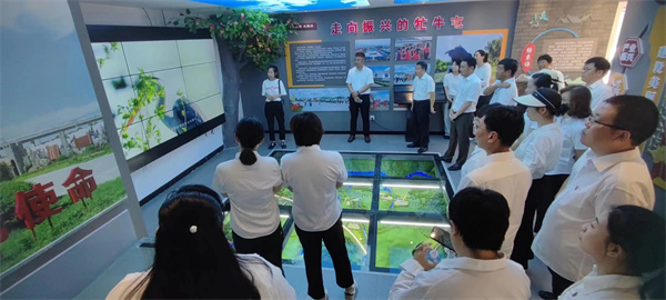 在鄉(xiāng)村振興展示廳,大家觀看視頻,聽講解員講述牤牛屯在習(xí)近平總書記生態(tài)文明建設(shè)思想指引下新農(nóng)村面貌。