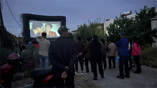 夜幕低垂、群星閃耀,村中央,一幅碩大的銀幕矗立在街道上,伴隨著錦州城市宣傳片和紅色歌曲MV的播放,現(xiàn)場圍觀的百姓無不拍手稱贊。村上一位年逾古稀的大爺說:“我年輕的時候,公社也總來放電影,那時候周邊的村屯百姓無論多遠,黑燈瞎火的都過來看,像《地道戰(zhàn)》《地雷戰(zhàn)》《渡江戰(zhàn)役》啥的,一色兒的黑白片,那大伙兒看的都勁兒勁兒的。隨著社會在發(fā)展,現(xiàn)在的設(shè)備與效果都嘎嘎好,反而看的人少了,年輕人都外出打工,孩子也都不在家,村里大多數(shù)都是留守老人,除了忙農(nóng)活,就是自己找點樂兒,市里還能想著咱這些村民,上門兒放電影,太謝謝你們了!”深秋的鄉(xiāng)村,涼風(fēng)習(xí)習(xí),萬籟俱寂,只有電影《祝你平安》的光亮與聲音劃破了這份寧靜,同時也為這里的百姓帶來了貼心的問候與溫情。